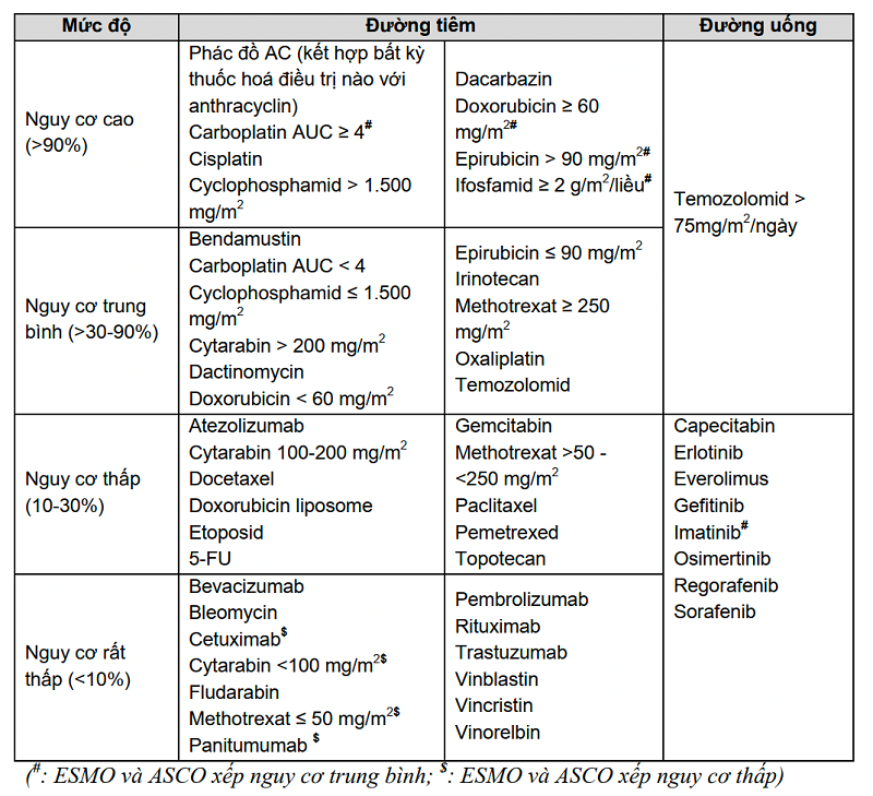 Theo Hướng dẫn của Hiệp hội Ung thư Hoa Kỳ (NCCN) và Hướng dẫn thực hành dược lâm sàng cho dược sỹ trong một số bệnh không lây nhiễm của Bộ Y tế (2019), mức độ gây nôn của các thuốc điều trị ung thư được phân loại như Bảng 1.