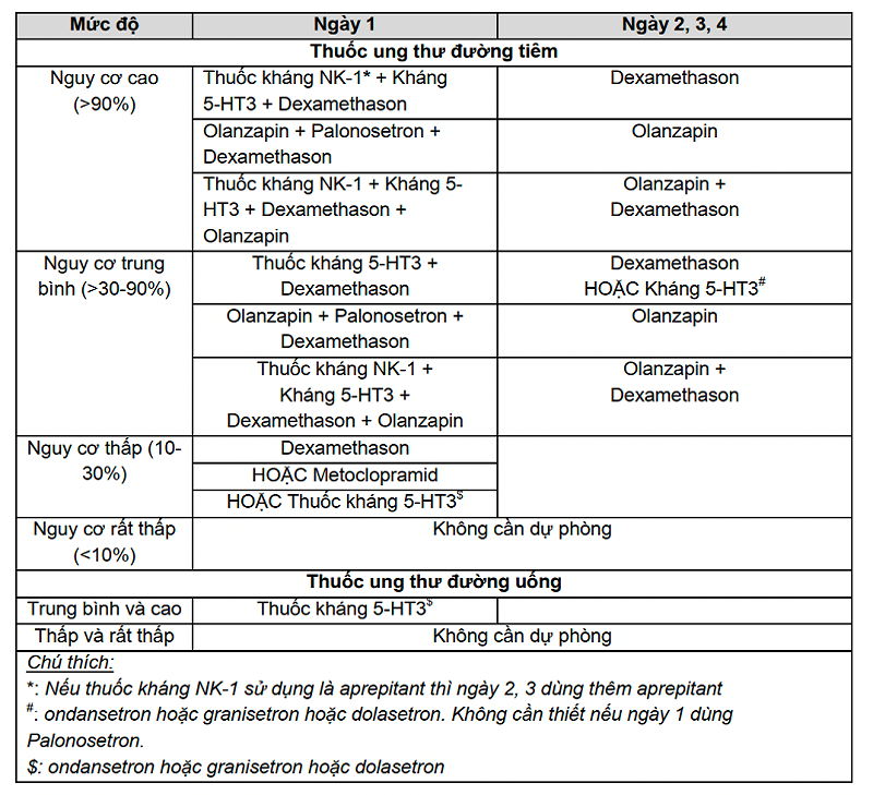 Theo Hướng dẫn của Hiệp hội Ung thư Hoa Kỳ (NCCN) và Hướng dẫn thực hành dược lâm sàng cho dược sỹ trong một số bệnh không lây nhiễm của Bộ Y tế (2019), khi sử dụng thuốc điều trị ung thư có nguy cơ gây nôn có thể sử dụng các phác đồ kiểm soát nôn như trong Bảng 2.