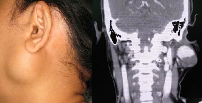 - Khối u: Một khối u không đau hoặc đau ở vùng mang tai (phía trước tai), góc hàm, hoặc trong miệng.
