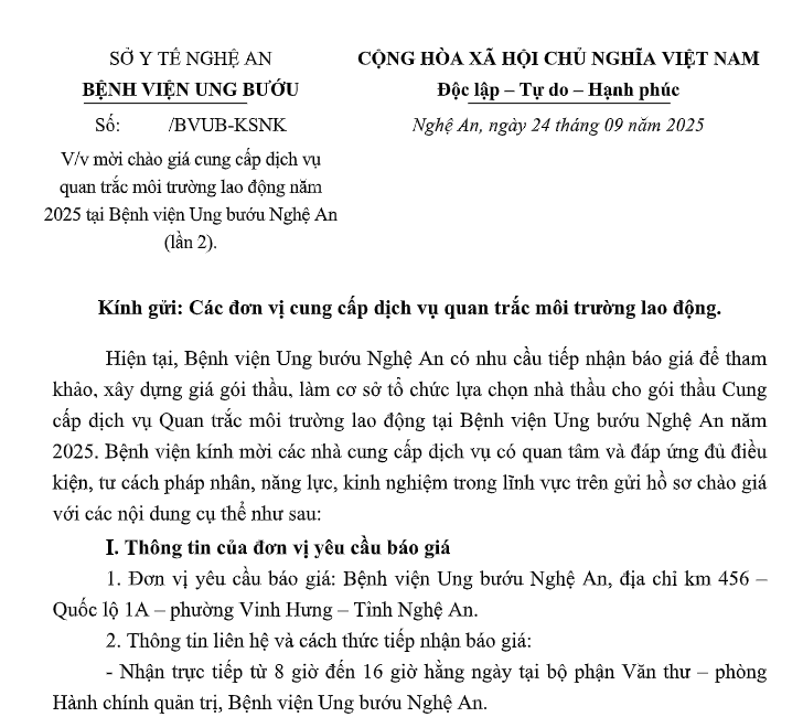 1. Đơn vị yêu cầu báo giá: Bệnh viện Ung bướu Nghệ An