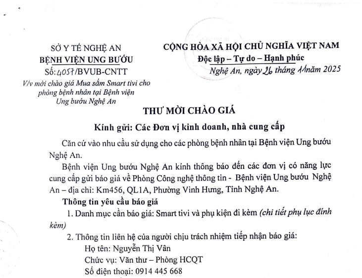 2. Thông tin liên hệ của người chịu trách nhiệm tiếp nhận báo giá: Nguyễn Thị Vân (điện thoại: 0914 445 668) – Bộ phận Văn thư -Phòng Hành chính quản trị – Bệnh viện Ung bướu Nghệ An.